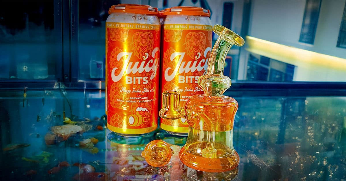 Juicy Bits IPA by WeldWerks Brewing and amber glass rig on display at Goodz and Brews in Phoenix
